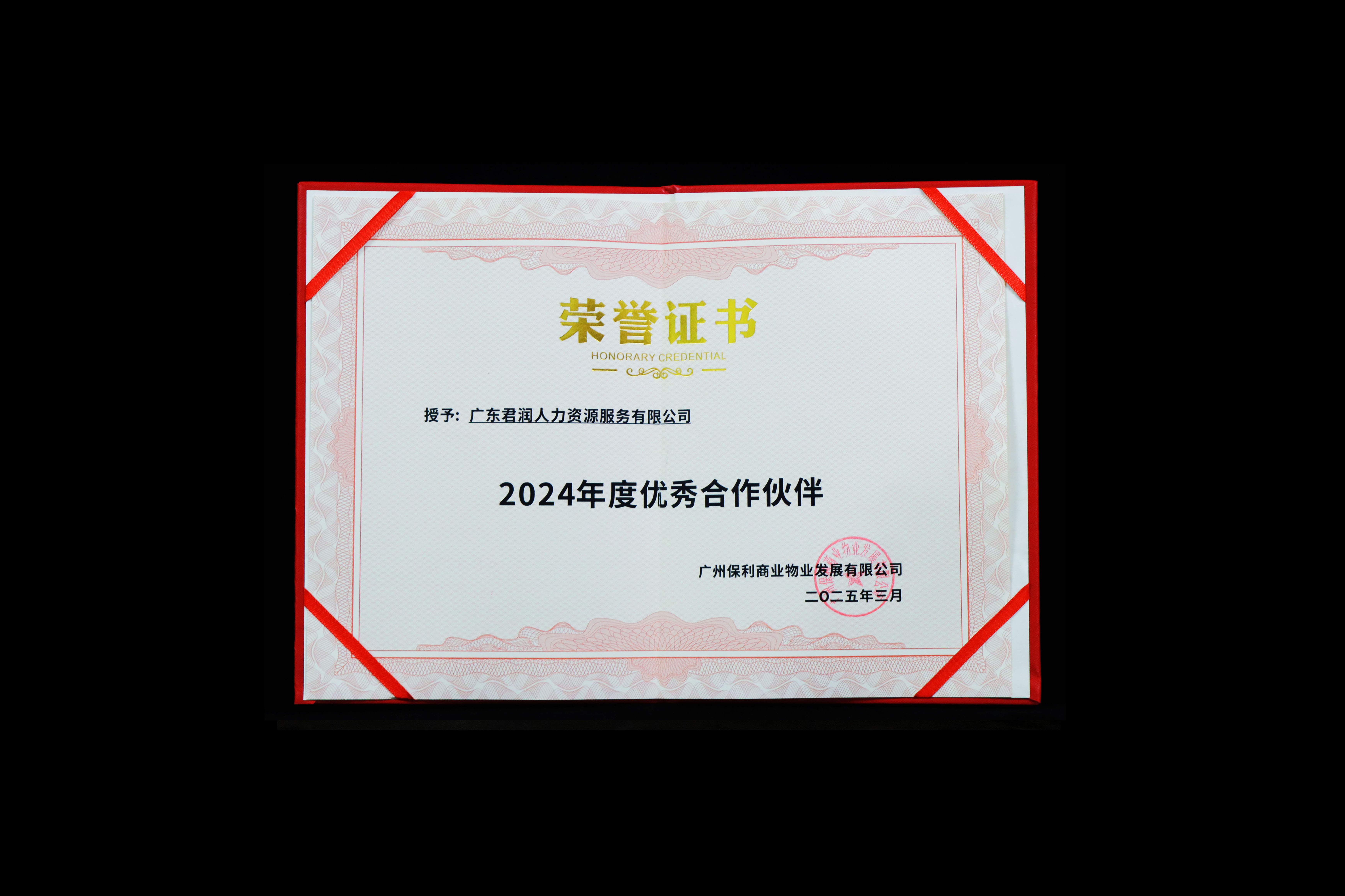 2025 年 3 月,君润人力荣获保利物业2024 年度优秀合作伙伴
