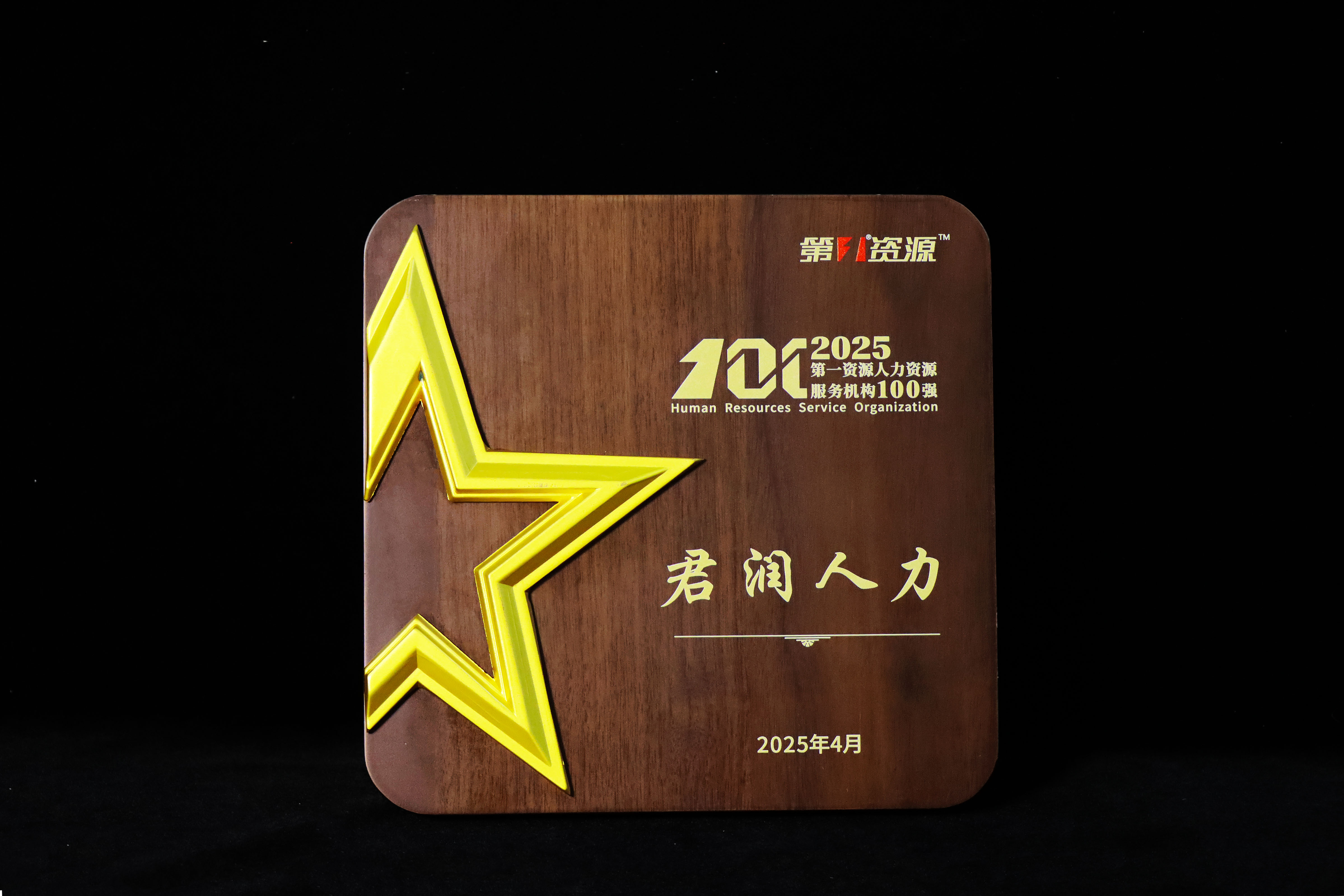 2025 年 4 月,君润人力荣获2025 第一资源人力资源服务机构 100 强