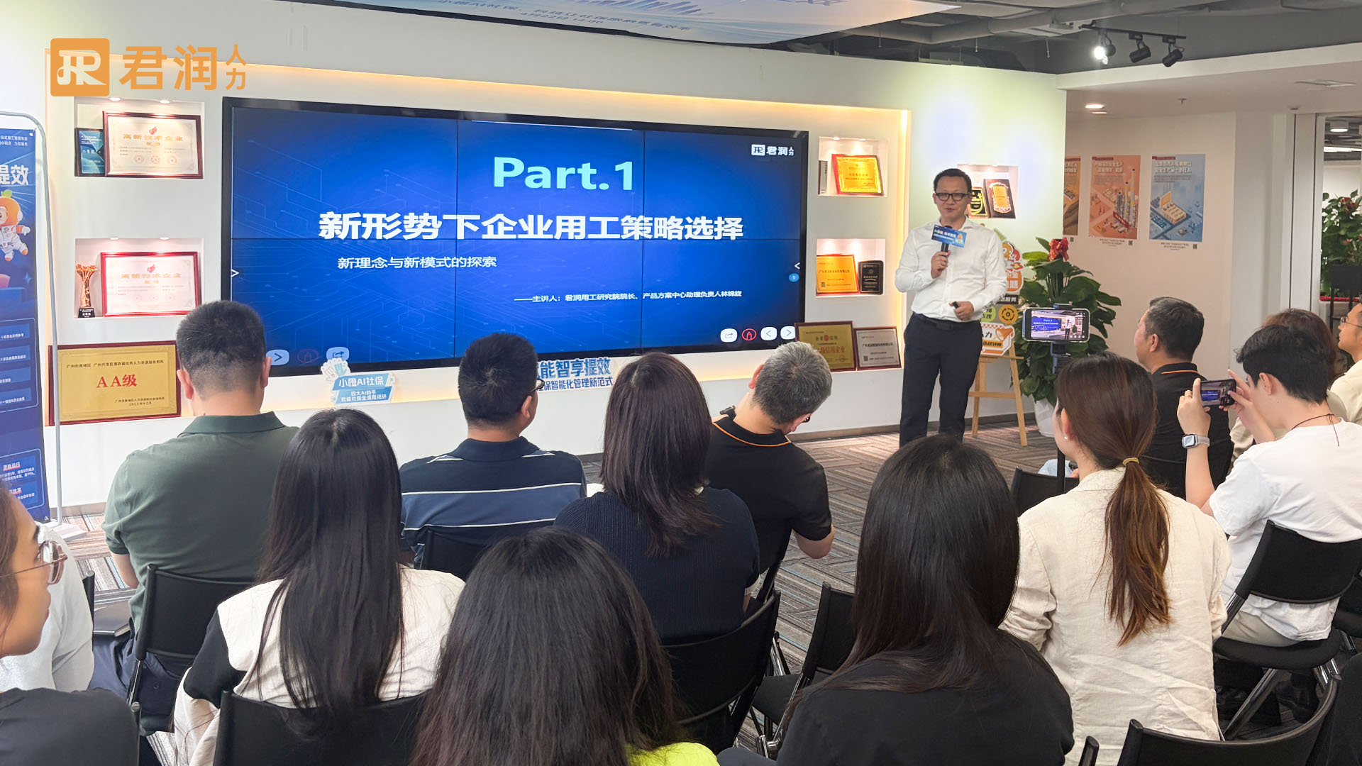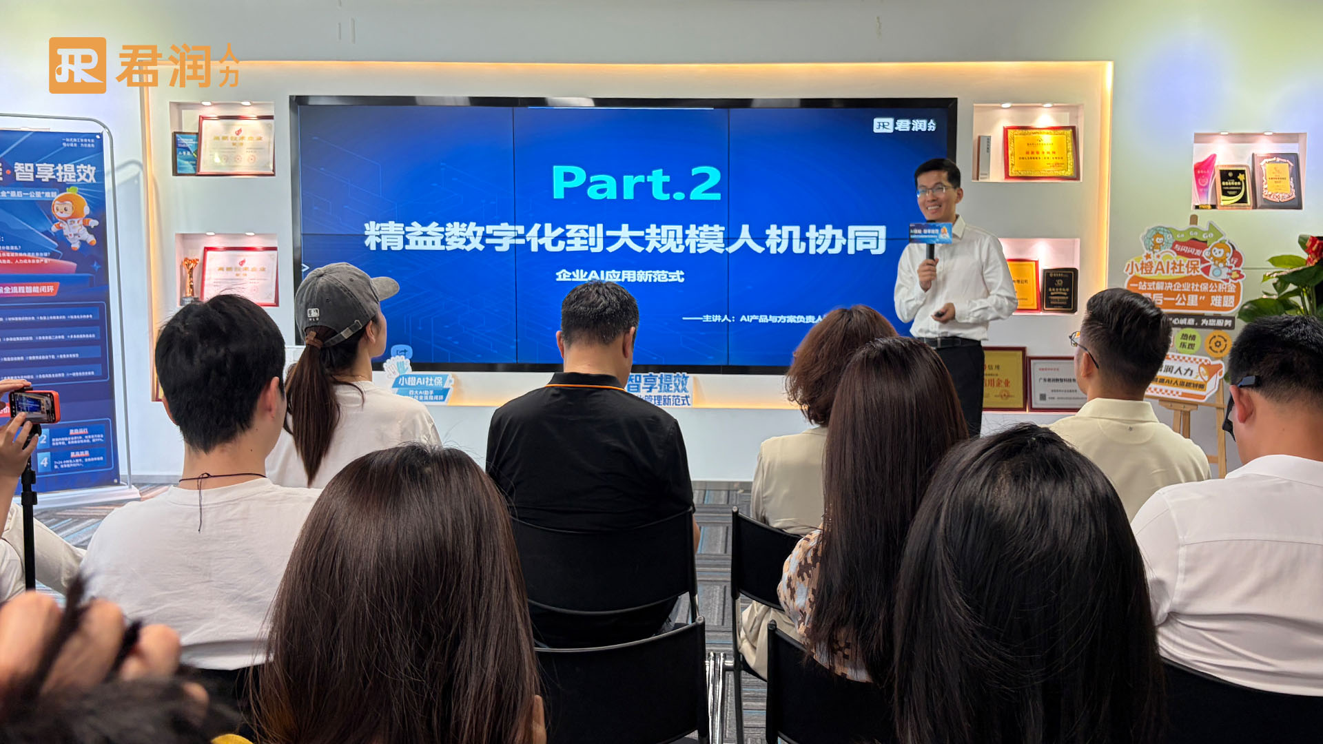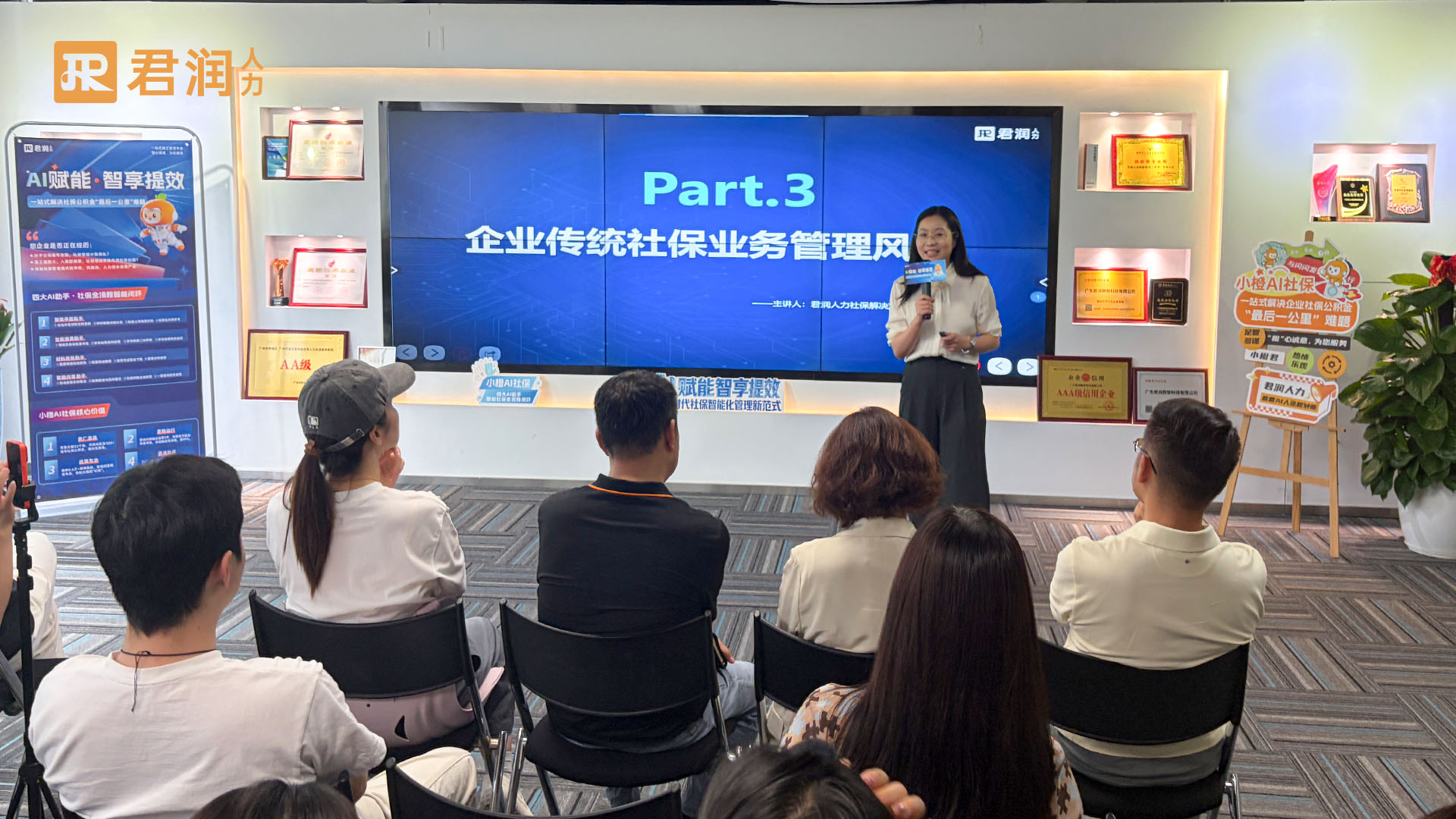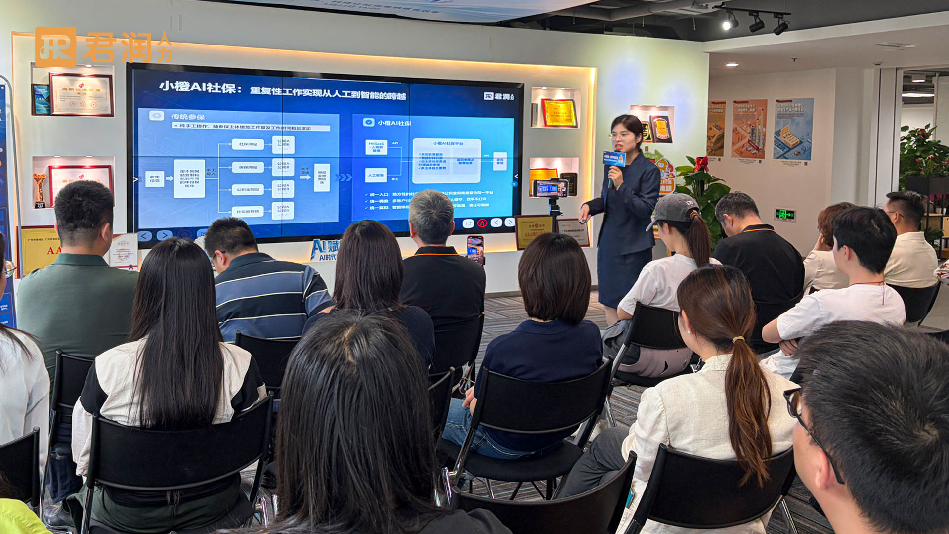 发布会上,君润产品方案中心杜家婷正式推出小橙AI社保,为企业社保管理困境提供全新解决方案,并向所有关注企业社保智能化升级的伙伴致以诚挚感谢。